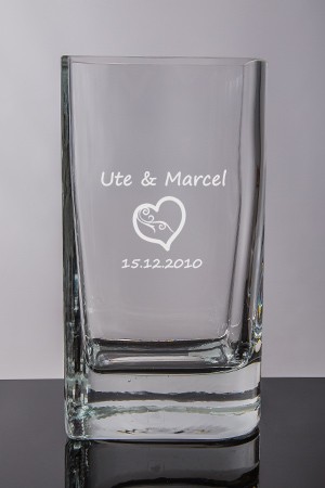 Die Vase wird mit einem "Hochzeit-Motiv" und "2- Zeilen Text" graviert.
